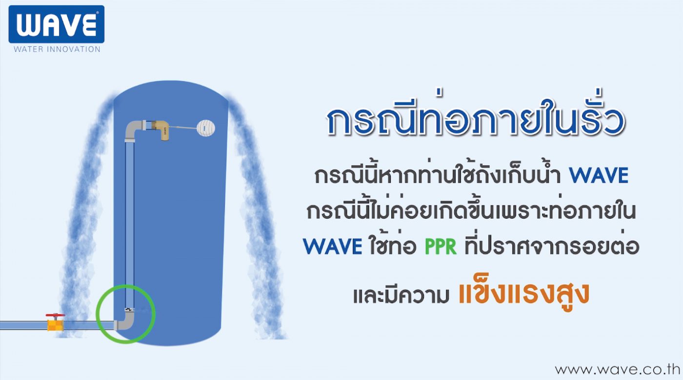 กรณีนี้ไม่ค่อยเกิดขึ้นบ่อยหากท่านใช้ถังเก็บน้ำเวฟ เพราะเราใช้ท่อ PPR ที่เชื่อมด้วยความร้อนปราศจากรอยต่อ ทำให้มีความแข็งแรงสูง ? และรั่วซึมได้ยากอีกด้วย