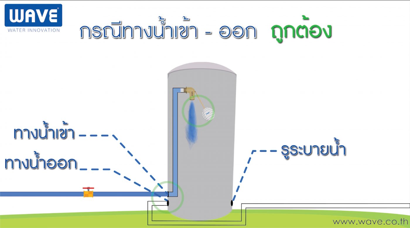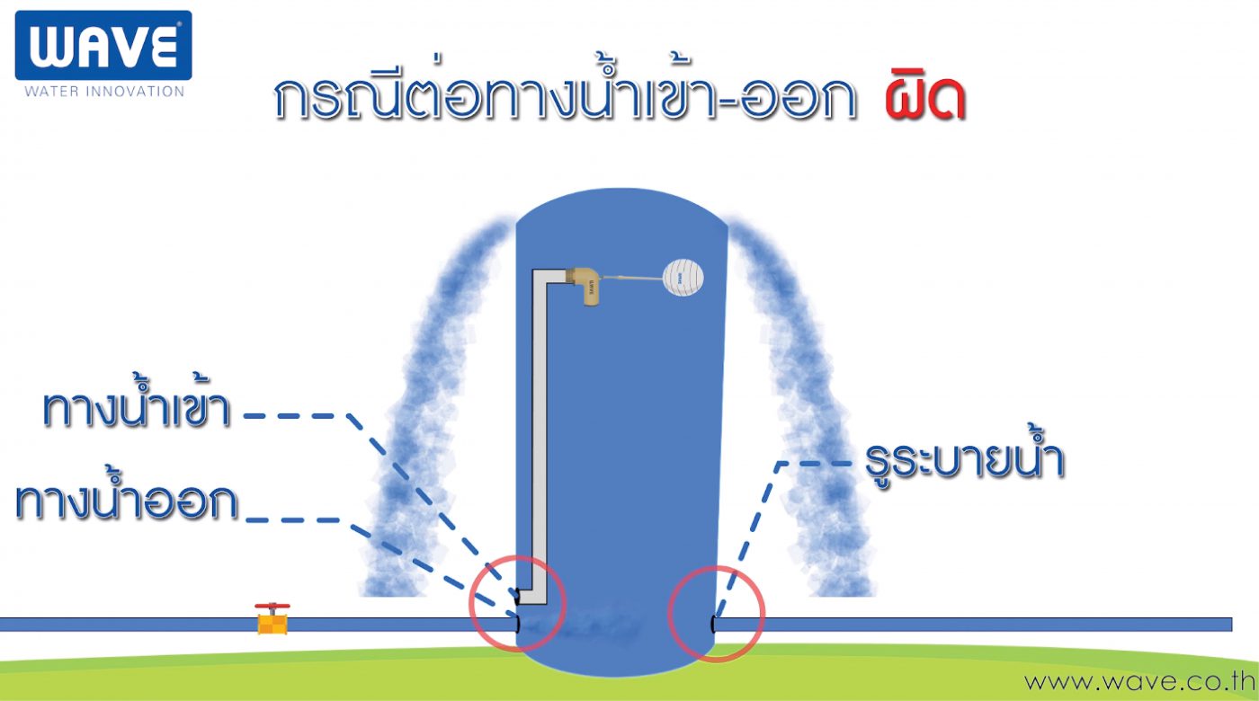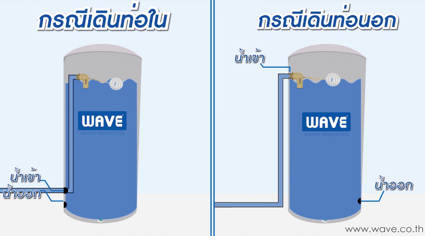 - กรณีเดินท่อภายนอก เกลียวต่อลูกลอยจะอยู่ตรงรูน้ำเข้า เพราะน้ำที่เข้ามาภายในถังจะต้องผ่านลูกลอยทั้งสองกรณี