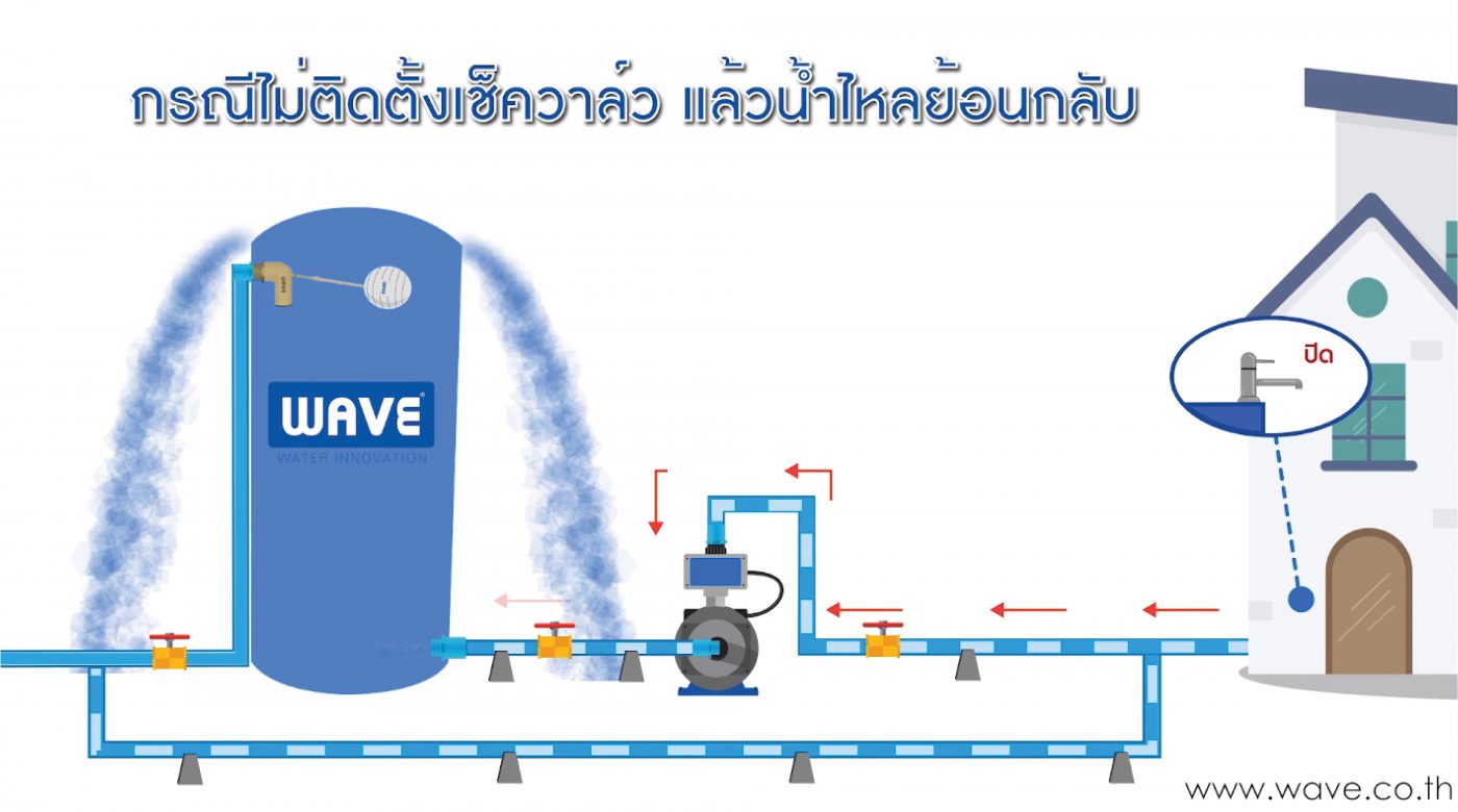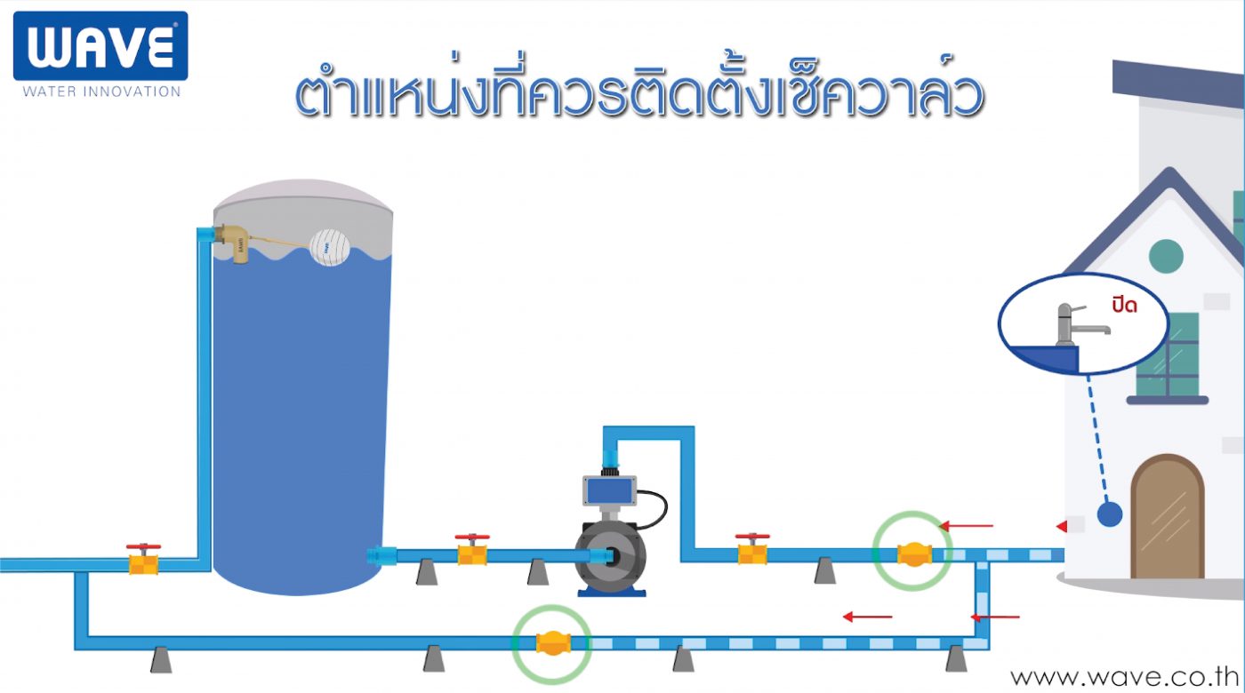 - กรณีที่ปั๊มน้ำไม่มีเช็ควาล์วในตัวหรือชำรุด การติดตั้งอุปกรณ์เช็ควาล์วเสริมเป็นสิ่งจำเป็น เพราะทำหน้าที่ควบคุมน้ำให้ไหลไปในทิศทางเดียวและป้องกันการตีกลับของแรงดันน้ำที่จะมากระทบปั้ม