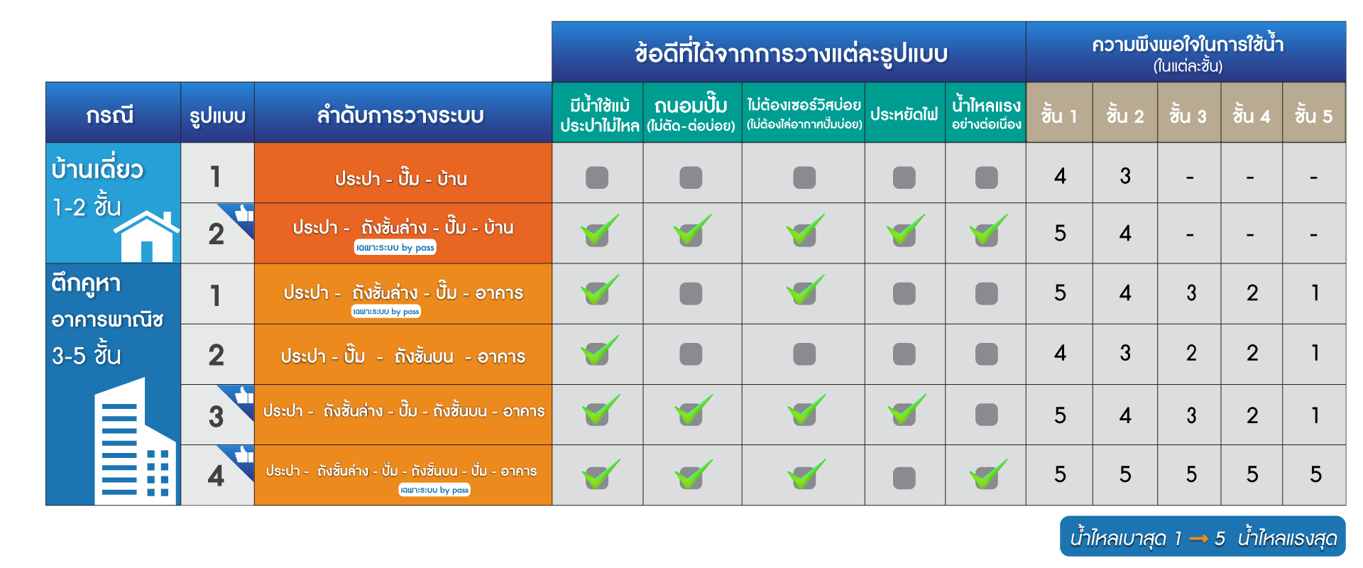 ตารางสรุป ข้อดี – ข้อเสีย การวางถังเก็บน้ำและปั๊มน้ำในแต่ละจุด