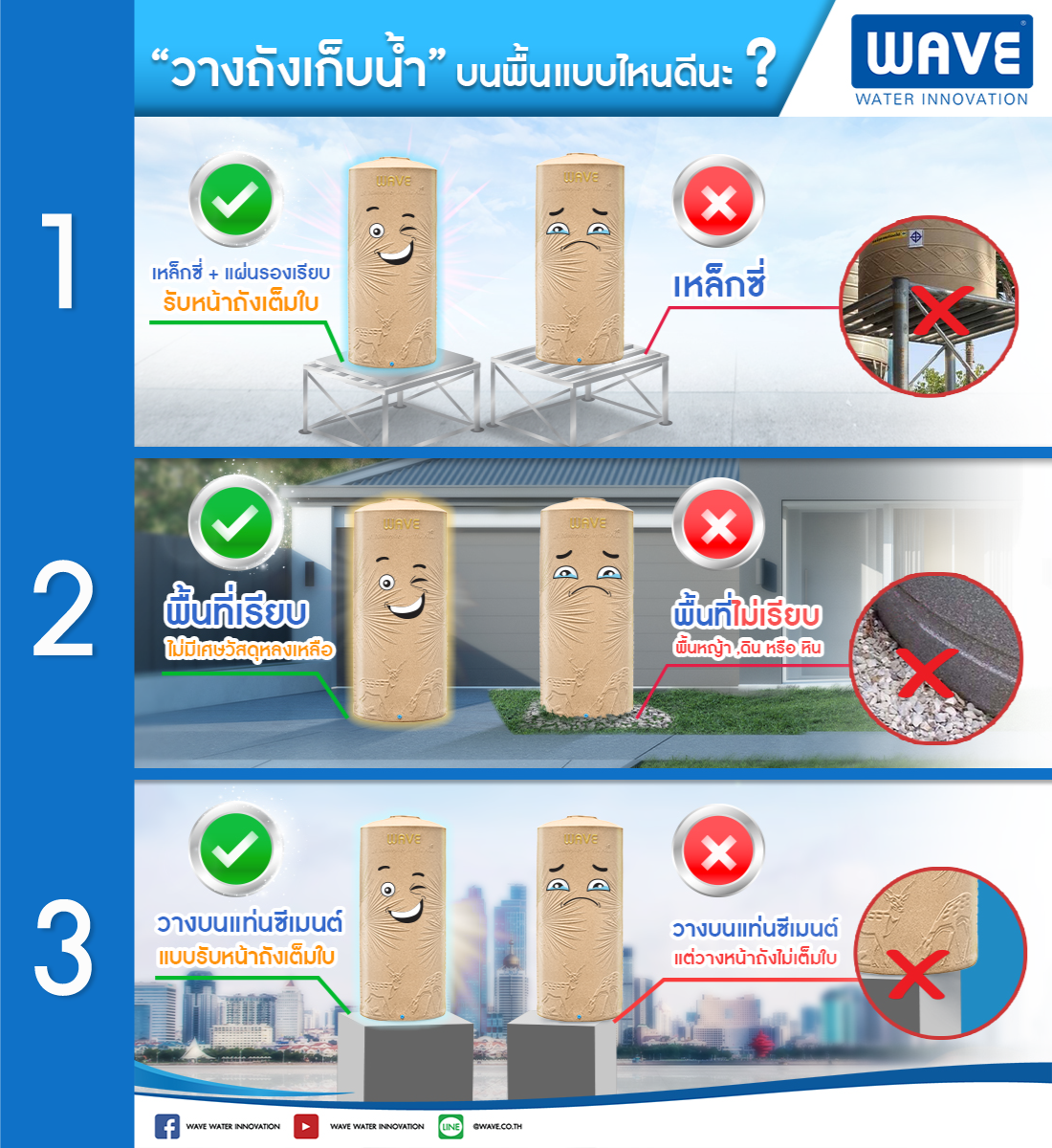 1. พื้นผิวที่ใช้ในการวางถังเก็บน้ำนั้นสำคัญมาก เพราะจะช่วยส่งผลให้ตัวถังมีอายุการใช้งานที่ยาวนานยิ่งขึ้น ดังนั้นการ วางถังบนเหล็กซี่ หรือพื้นที่ที่ไม่มีความเรียบ เป็นสิ่งที่ไม่ควรทำอย่างยิ่ง เพราะจะทำให้ตัวถังด้านล่างเกิดการบวมออกตามช่องเหล็ก ซึ่งอาจจะส่งผลให้ถังรั่วและชำรุดได้ และทำให้น้ำรั่วได้นั่นเอง  หากต้องการจะวางถังบนซี่เหล็กนั้น สามารถทำได้นะ แต่ต้องหาแผ่นหรือสิ่งที่มีพื้นผิวเรียบมาปูทับไว้นั่นเอง เพื่อรองรับหน้าถังได้เต็มใบ ช่วยกระจายแรงกดจากตัวถังได้อย่างทั่วถึง ส่งผลให้ถังเกิดรอยร้าว หรือรอยบุบได้ยาก ลดปัญหาน้ำรั่วซึมได้ดีเลย