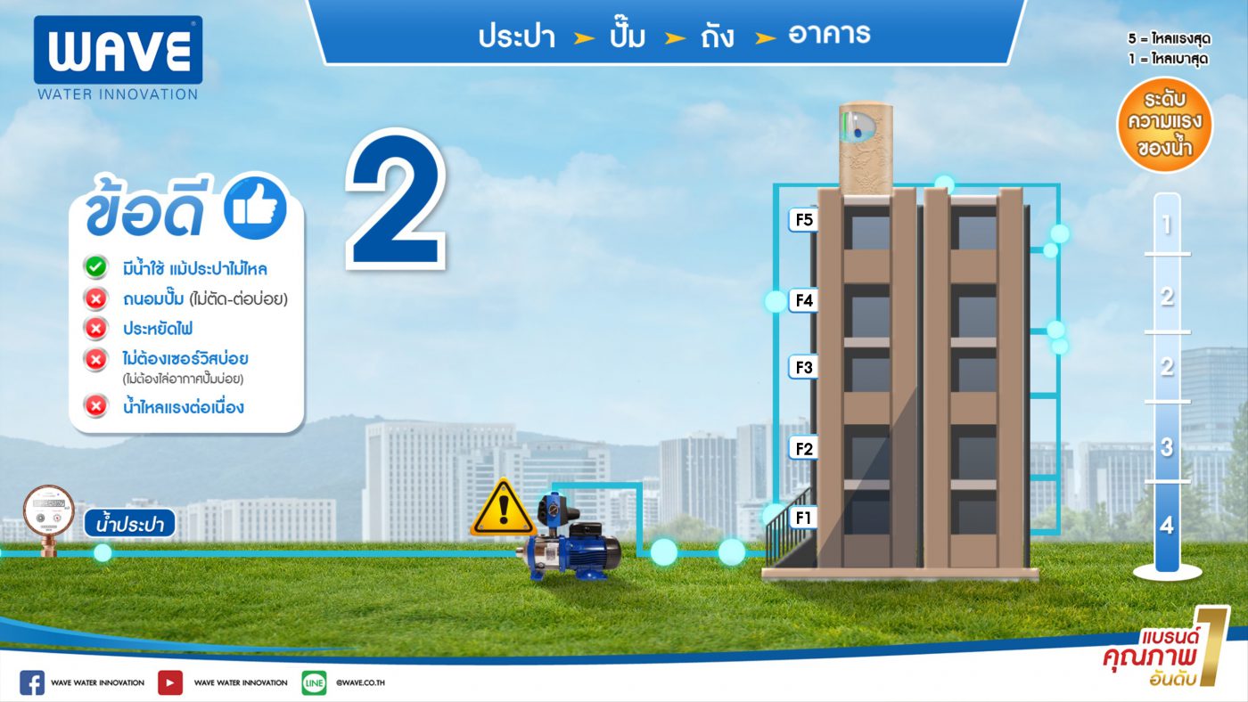 แบบที่ 2 (ประปา — ถัง — ปั๊ม — อาคาร)