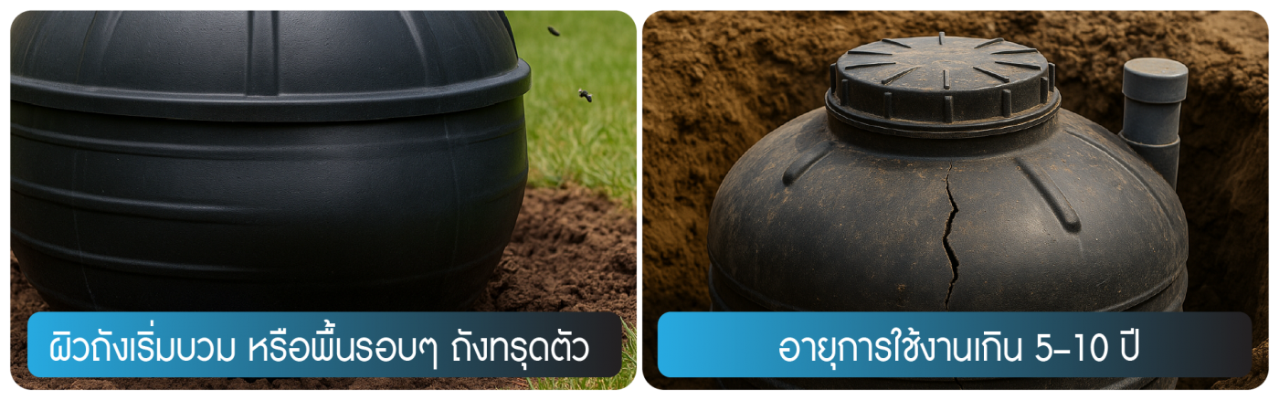 ถึงแม้ ถังบำบัดน้ำเสีย จะออกแบบมาให้ใช้งานได้นาน แต่ถังที่ถูกติดตั้งมานานเกิน 10 ปี ก็เริ่มมีความเสี่ยงที่จะเสื่อมสภาพ ทั้งจากแรงดันของของเสียภายในและแรงดันดินภายนอก รวมถึงการเปลี่ยนแปลงของสภาพดินและน้ำใต้ดินตามฤดูกาล