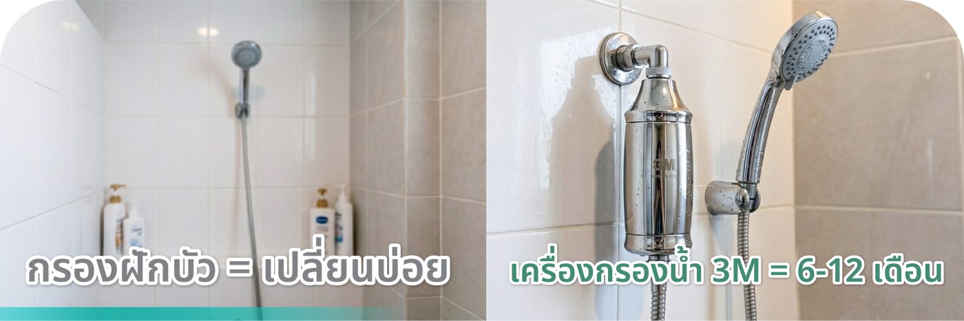 | เครื่องกรองน้ำอาบ 3M | ลดคลอรีนและสิ่งปนเปื้อน | ผิวนุ่มขึ้น ลดความแห้ง | 6–12 เดือน |