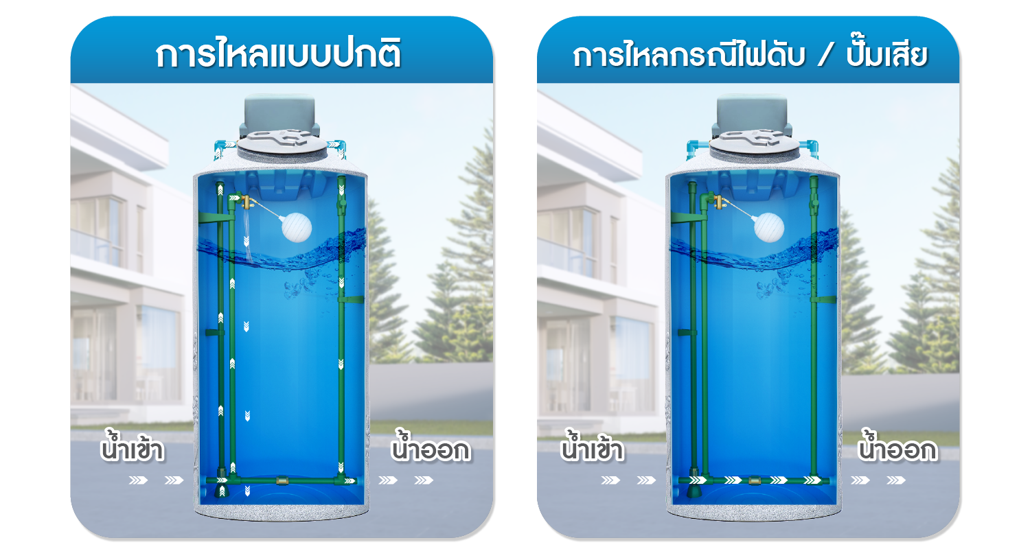 โดยปกติถังเก็บน้ำทั่วไป เมื่อเกิดเหตุไฟดับหรือปั๊มชำรุดก็จะไม่มีน้ำไว้ใช้ เพราะเป็นการต่อน้ำแบบระบบเดียว… ดังนั้นจึงต้องต่อท่อให้เดินน้ำแบบ 2 ระบบ เพื่อให้น้ำสามารถไหลได้ แต่ก็ต้องเสียค่าใช้จ่ายในการซื้อท่อมาเสริม และยังเปลืองพื้นที่อีกด้วย  แต่ปัญหานี้จะไม่เกิดขึ้นกับ ถังเก็บน้ำคู่ปั๊ม เพราะถูกออกแบบมาให้มีการเดินน้ำแบบ 2 ระบบ(AUTO DIRECTED BYPASS ) ภายในตัวถัง หมดปัญหาน้ำไม่ไหล กรณี ไฟดับหรือปั๊มเกิดขัดคล่อง อุ่นใจได้ น้ำไหลตลอดแน่นอน
