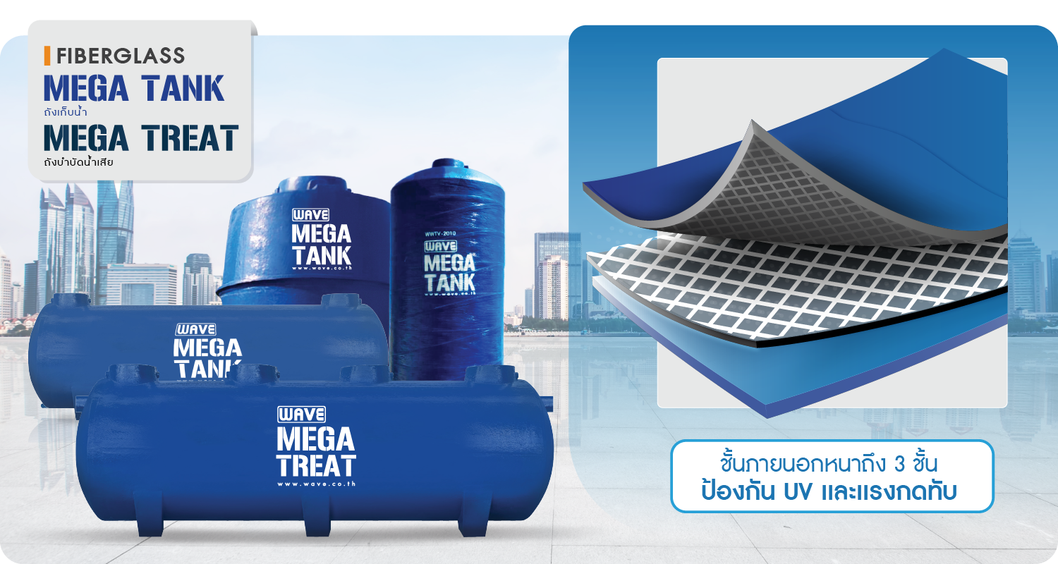 ถังไฟเบอร์กลาส MEGA TANK ผลิตโดย บริษัท เวฟ โปรดักท์ จำกัด มีความมุ่งมั่นที่จะคิดค้นและสรรหานวัตกรรมใหม่ๆ ผนวกกับการสร้างผลิตภัณฑ์ที่หลากหลายเพื่อตอบสนองนโยบายรักษาสิ่งแวดล้อม ภายใต้ Concept “WATER INNOVATION” หรือ “ที่สุดนวัตกรรมเรื่องน้ำ” เพื่อเน้นย้ำความเป็นผู้นำในเรื่องนวัตกรรมน้ำที่พัฒนาอย่างก้าวไกล ด้วย ประสบการณ์การผลิตกว่า 25 ปี พร้อมทีมงามเเละบริการอย่างมืออาชีพ ลงมือทําพร้อมให้คําปรึกษาได้ครบจบในหนึ่งเดียว ดังนั้นลูกค้าจึงมั่นใจได้ในมาตรฐานและความปลอดภัยระดับสูงของผลิตภัณฑ์ของเรา