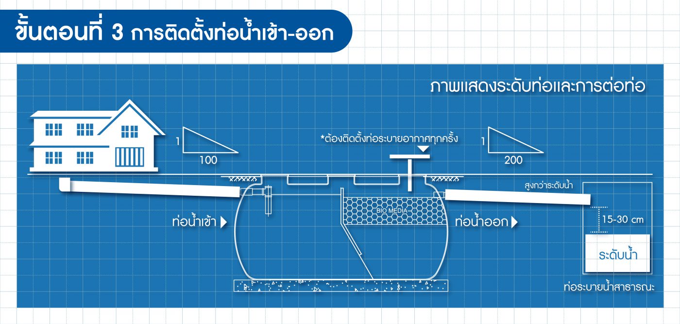 - ระยะท่อน้ำทิ้งออกจากถัง ต่อลงท่อระบายน้ำ ระยะลาดเอียงไม่น้อยกว่า 1 ซม. ต่อระยะความยาว 2 ม ( 1 : 200 ) และปลายท่อนํ้าออกควรอยู่เหนือระดับน้ำทิ้ง 15-30 cm
